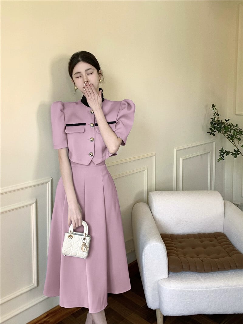 フレンチスタイルツーピースセット夏の新しいレトロパフスリーブジャケットハイウエストスカート胸ストリートスーツ女性 ハイウェスト サマー 夏物 nana75322824376 | modepoisson