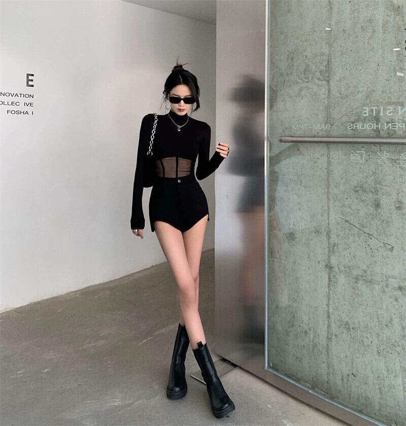 色:黒のショートパンツ,ブラックメッシュトップ
