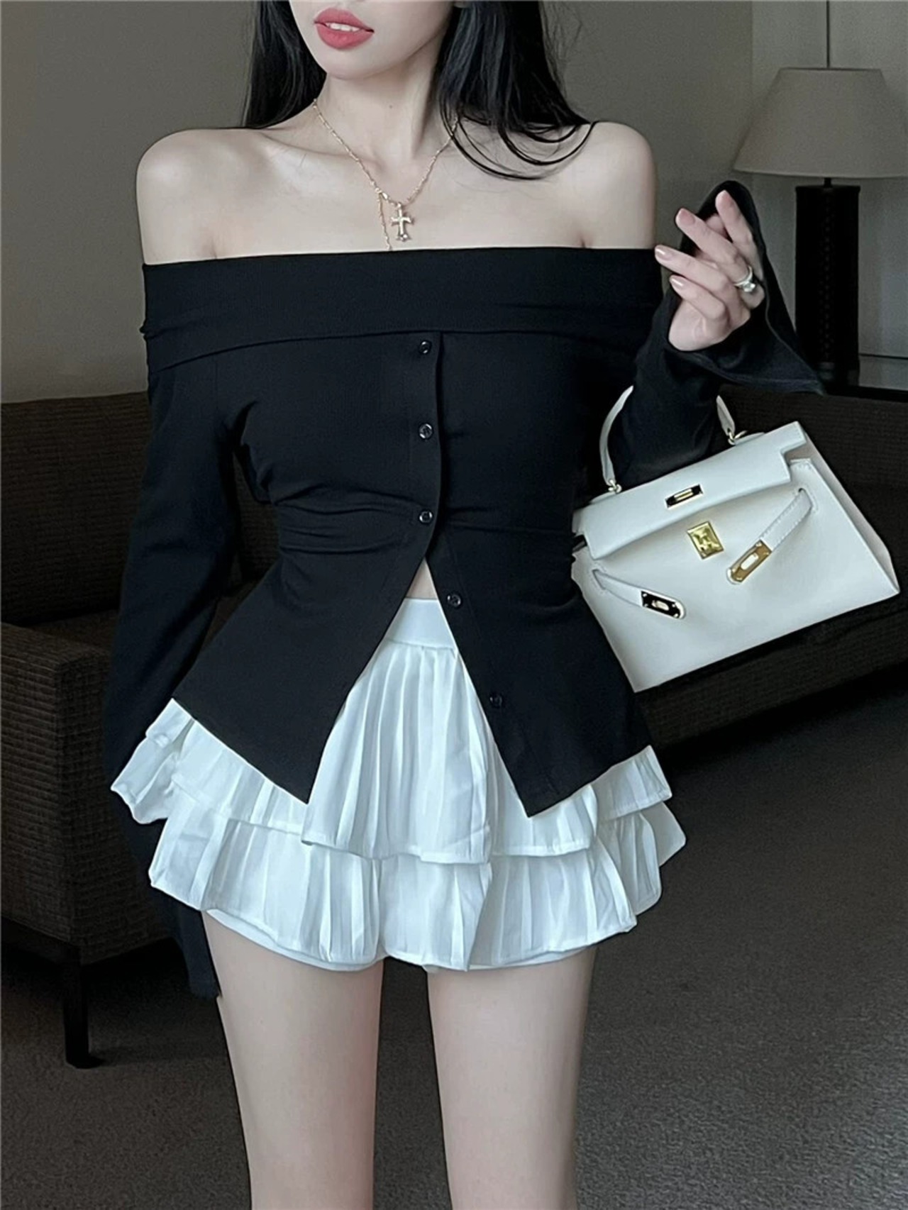 色:ホワイトトップ,ブラックトップ,白いプリーツスカート,ブラックプリーツスカート