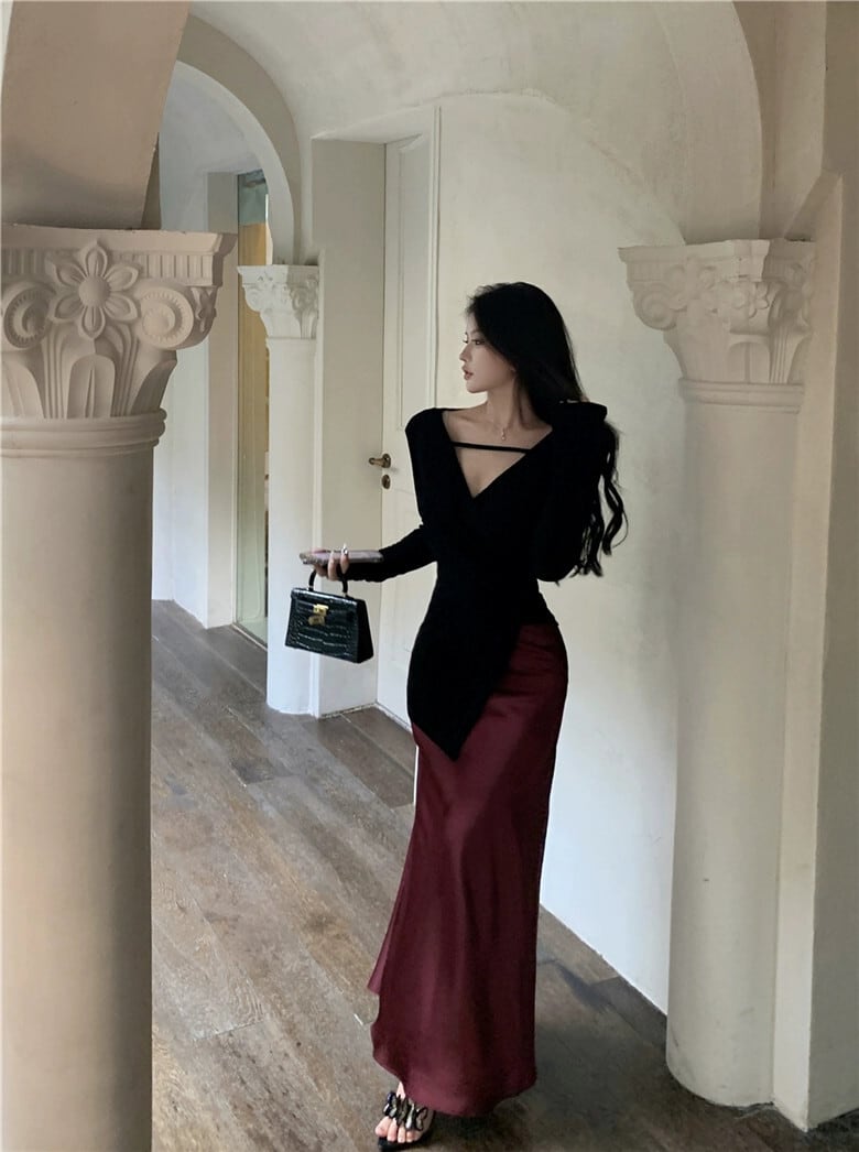 色:黒いTシャツ,ブルゴーニュスカート