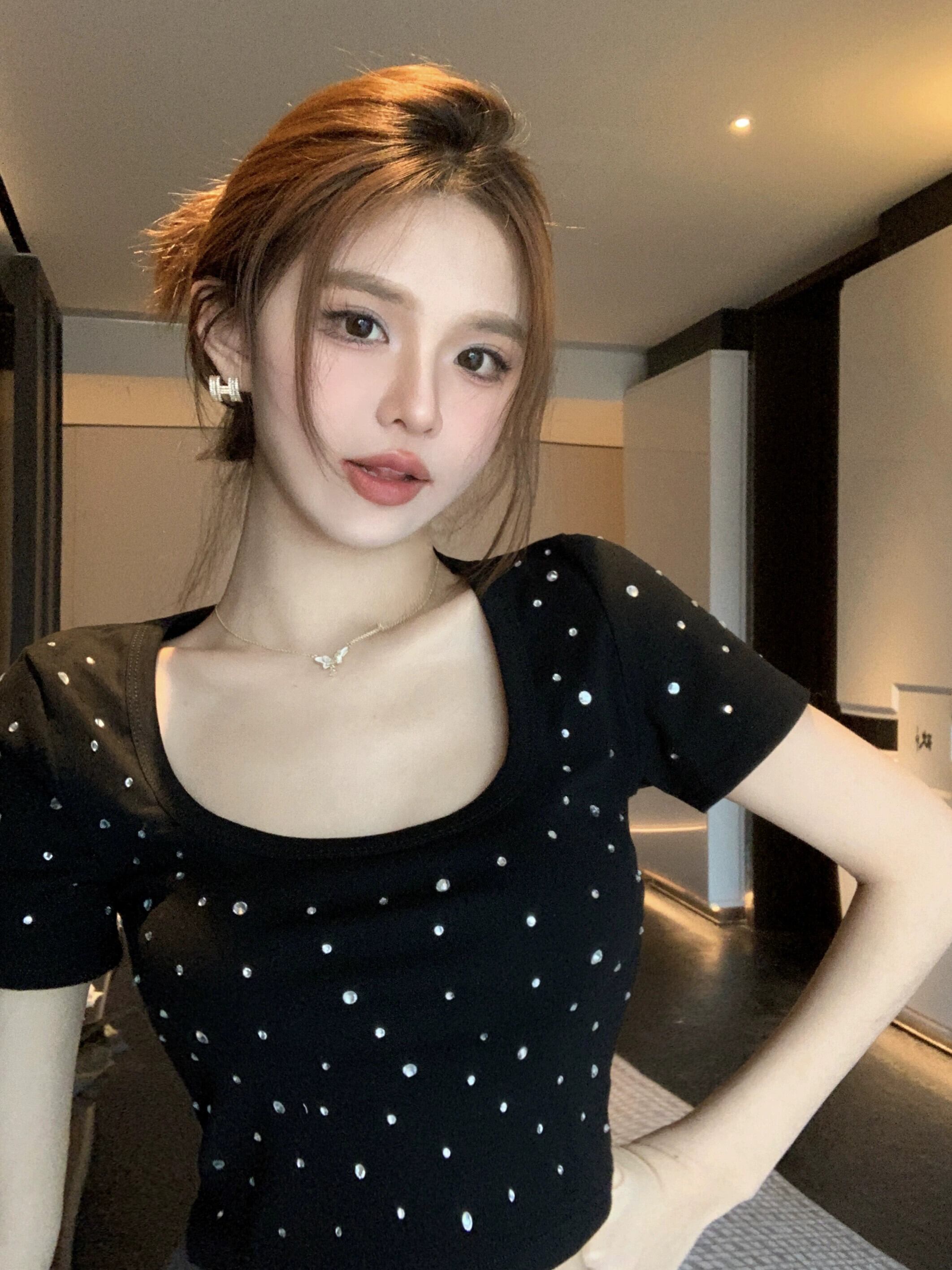 甘いホットガール重工業ホットダイヤモンド半袖 Tシャツ女性の夏のウエストスリムニッチフレンチショートトップ ハーフスリーブ 大人ガーリー スウィート キュート カジュアル サマー 夏物 nana4222003259 | modepoisson