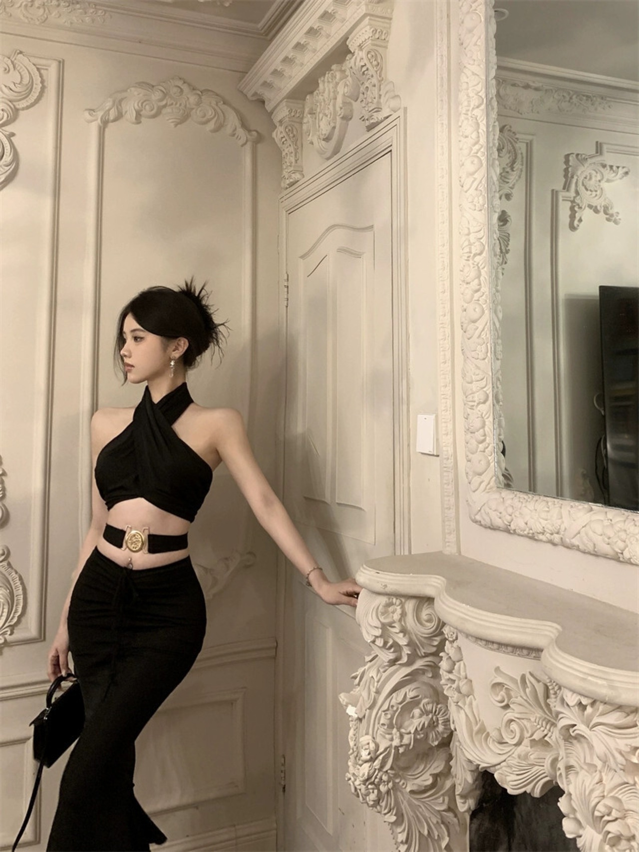 ホットセクシーなホルターネックトップハイウエストフィッシュテールスカート初秋2023新しいストリートスーツスカートツーピースセット女性 ハイウェスト オータム 秋物 nana88623637440 | modepoisson