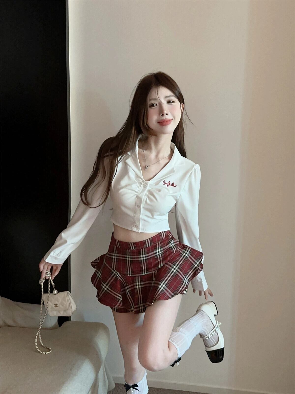 色:白長袖シャツ,赤い格子縞のスカート