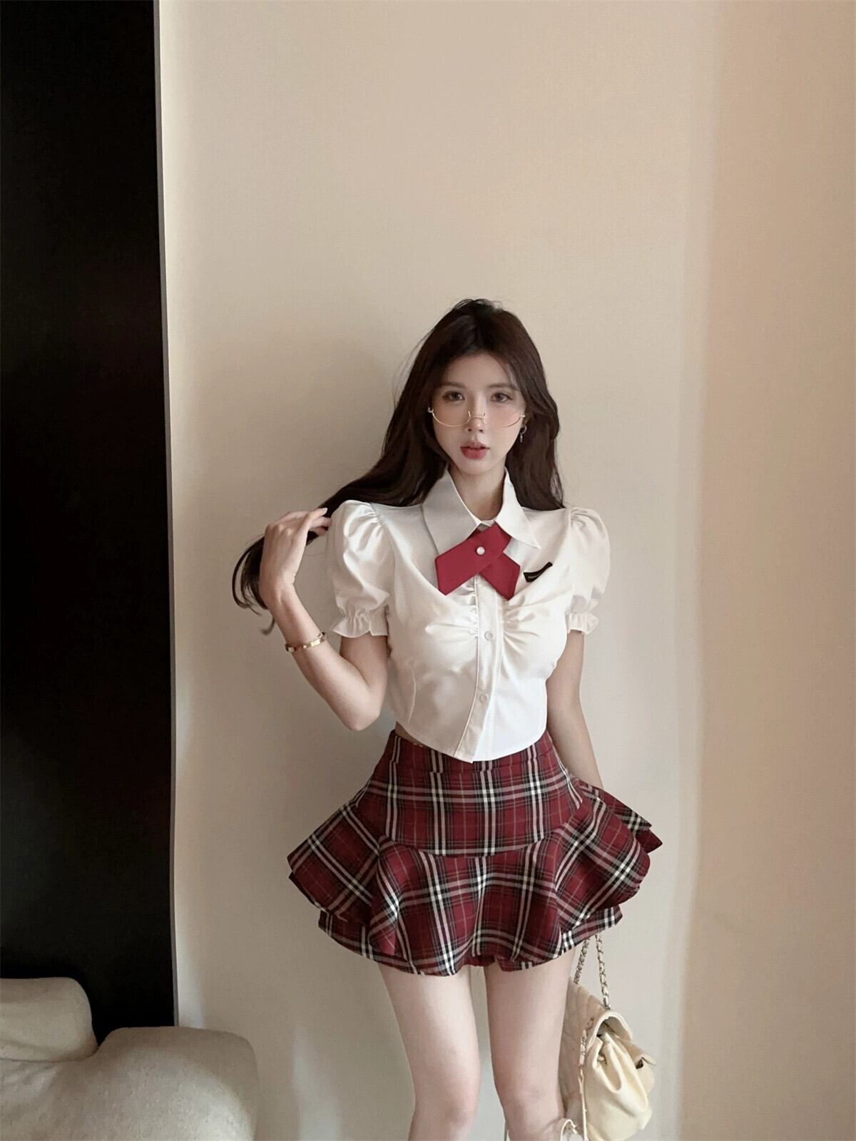 アメリカンキャンパススーツスカート夏甘辛シャツチェック柄スカートカレッジスタイルjkユニムツーピースセット女性 大人ガーリー スウィート キュート カジュアル サマー 夏物 nana39199357871 | modepoisson