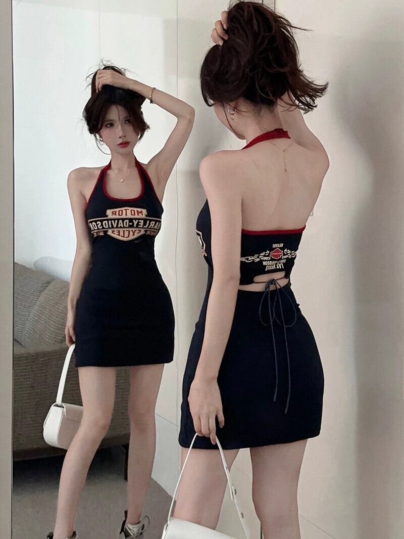 ホルターネックプリントサスペンダードレス女性の夏のアメリカンスリムスカートスリムヒップカバーショートスカート 2024 新スタイル サマー 夏物 nana81137080661 | modepoisson