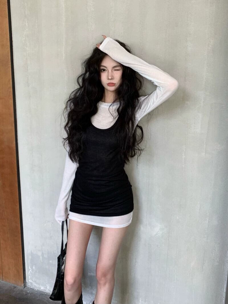 アメリカン甘辛スーツスカートセクシーな長袖ミッドレングスTシャツベストベストニッチ初秋ツーピースセット女性 ロング 大人ガーリー スウィート キュート カジュアル オータム 秋物 nana85120358014 | modepoisson