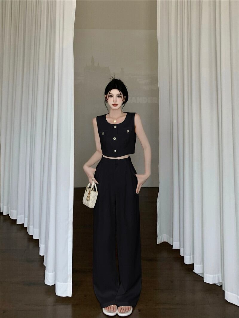 フレンチスタイル スモールフレグランススーツ 女性セレブ風 ベスト トップス ハイウエスト ワイドレッグパンツ 2点セット 夏 ハイウェスト サマー 夏物 ワイドパンツ nana31706674397 | modepoisson