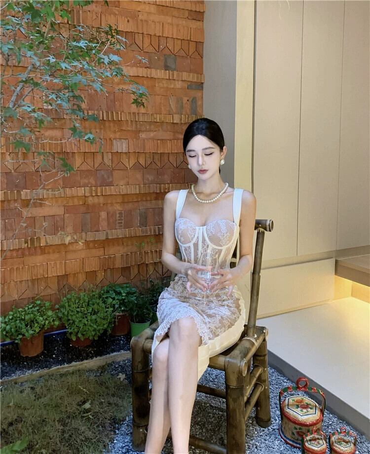 フランスのセクシーなサスペンダードレスの女性の夏の 2024 新しいレーススプライシングノースリーブスリム気質ミッドレングススカート サマー 夏物 nana97329107585 | modepoisson
