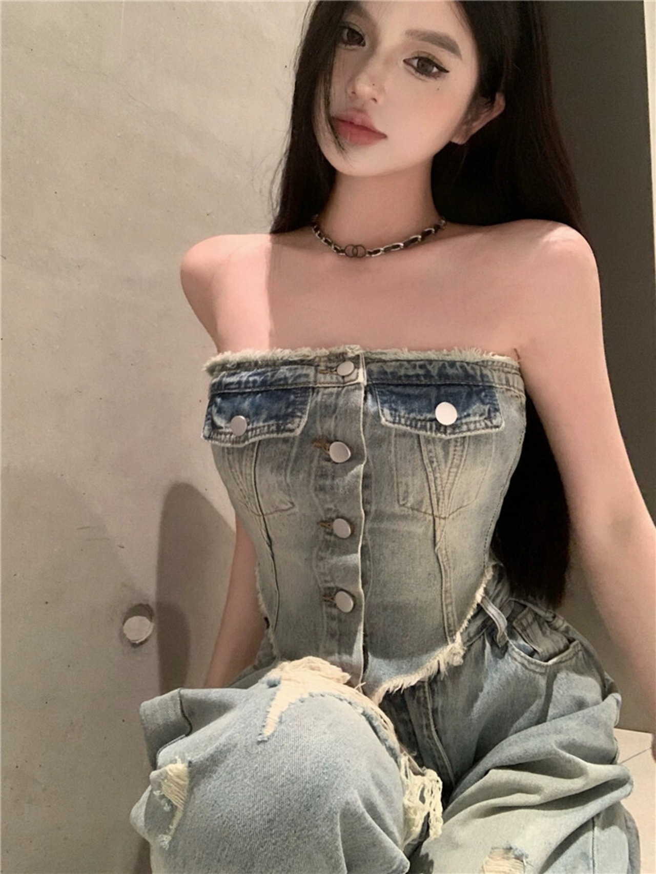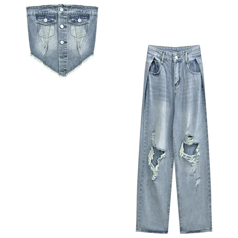 ヨーロッパとアメリカのレトロな気質、高級な甘いネクタイ、スリムフィットのチューブトップ、破れたジーンズ、ファッショナブルなサマースーツの女性 大人ガーリー スウィート キュート カジュアル 夏物 ヨーロピアン nana385601280 | modepoisson