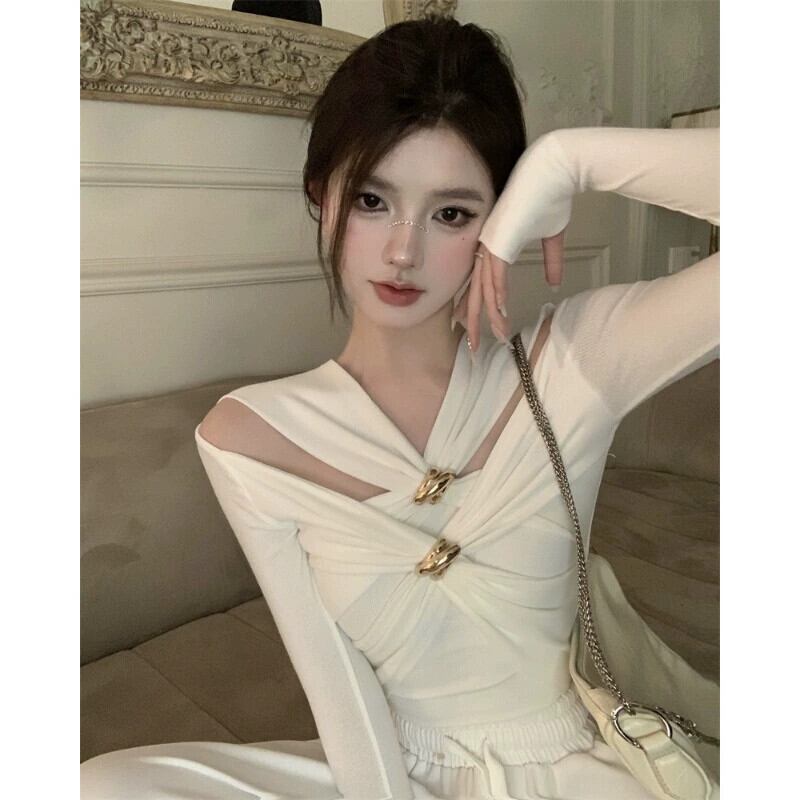 -スタイルシックなウエストを締めるショート長袖TシャツハイエンドVネッククロスタイブレストインカップトップレディース秋 ロング オータム 秋物 nana37544052593 | modepoisson